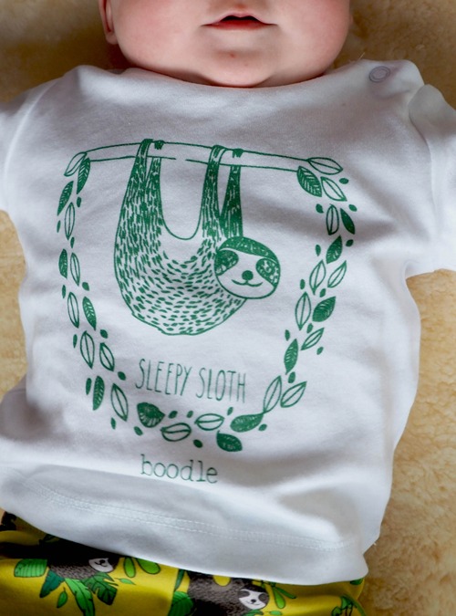 A beautifully soft organic cotton sleepy sloth baby T-shirt.